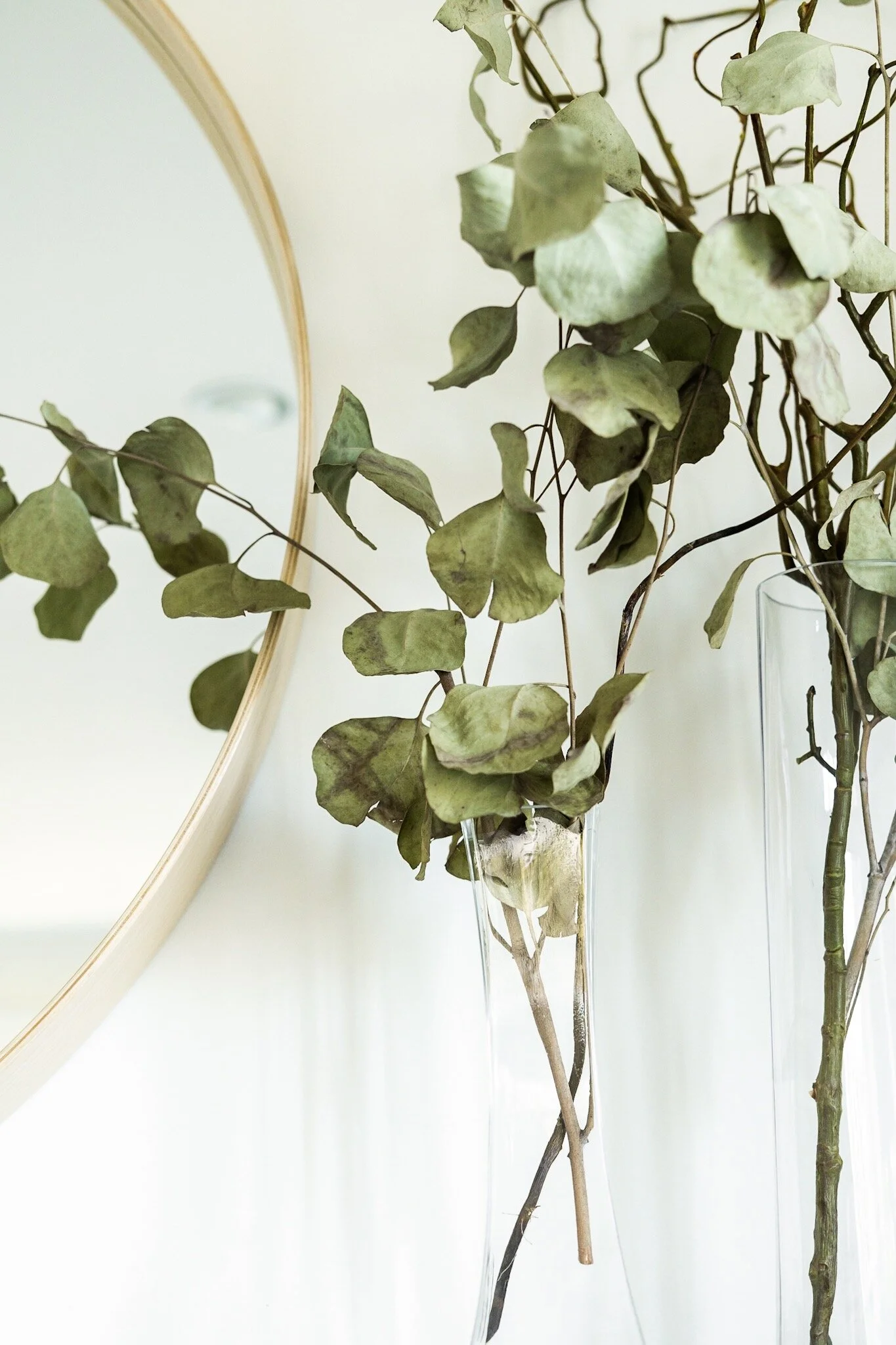 Wood elements are a great way to warm a space. A large wooden fruit bowl or woven chargers in a kitchen for example. Try bringing in other textures as well, such as natural or faux plants, fresh flowers etc.